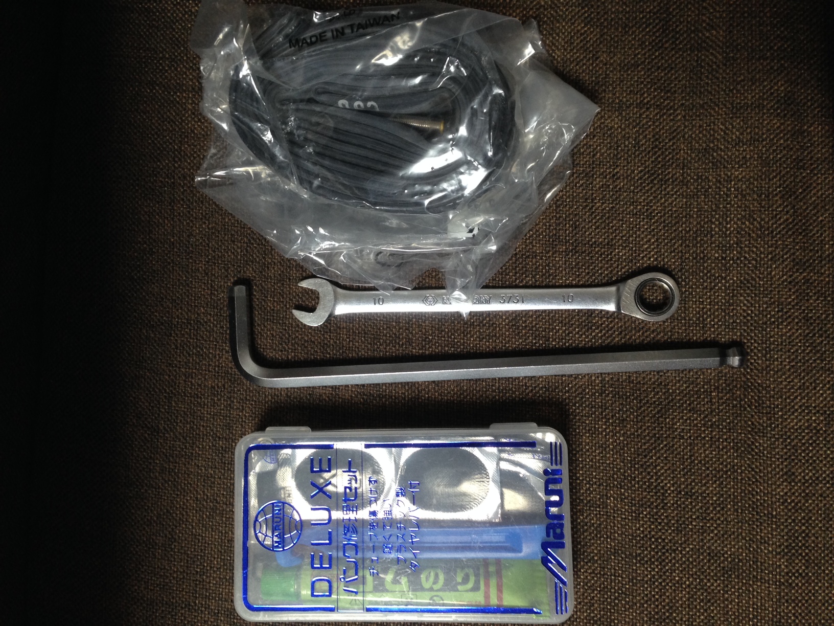 替えチューブ、アーレンキー、パンク修理セット、レンチです。